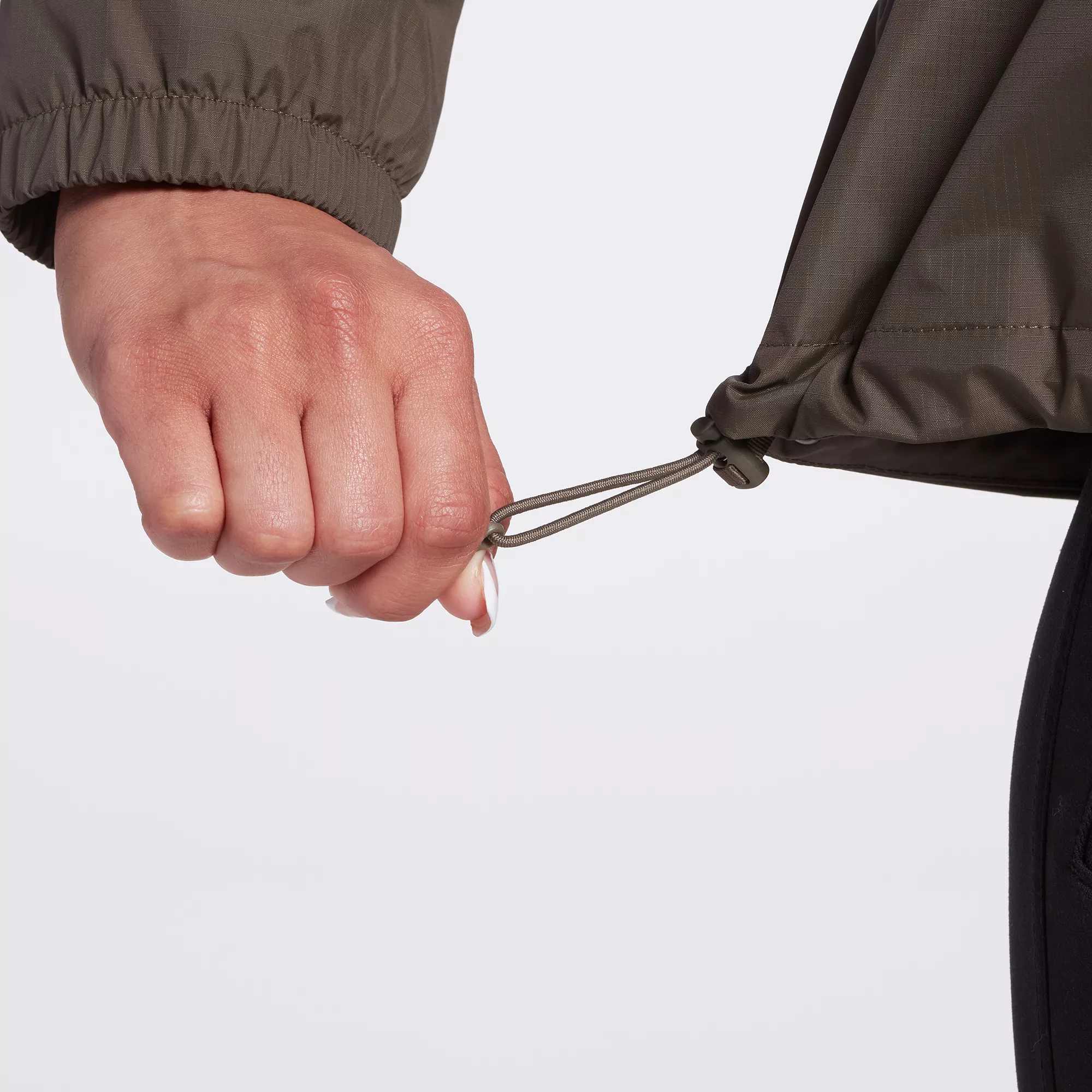 - Attached three-piece hood with an adjustable cord lock